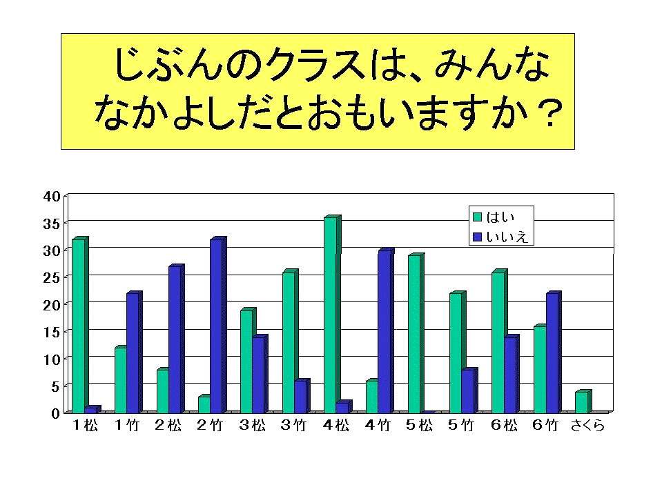 保健委員会と同様で、わかりやすく発表するには、コンピュータの利用が一番便利であると、児童は認識しており、グラフ化や呼びかけにコンピュータを利用した。その後に、人権標語や作文発表をしたりと、コンピュータの利用だけの集会から一歩進み、その活用方法に工夫が見られた。