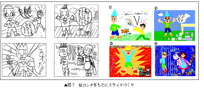 子どもたちが一番利用する機会の多いお絵かきソフト(インタープログ社のキットピクススタジオ2001)では,スライドショーが作成できる設定になっている。紙にかいた下絵をもとに,お絵かきソフトで表現する。一つひとつの絵を自分のイメージしたサウンドやタイミングでアニメーション設定し,スライドショーづくりをしている<図7>。
