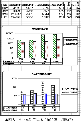 3年生の2学期から練習を開始する電子メール。実際に校外の人とメールを交換するようになるのは,4年生の後半くらいになることが多い。休み時間をふくめて,教科,総合,パソコンタイムの時間に,主に個人または小グループ単位で活動していく。<図8>