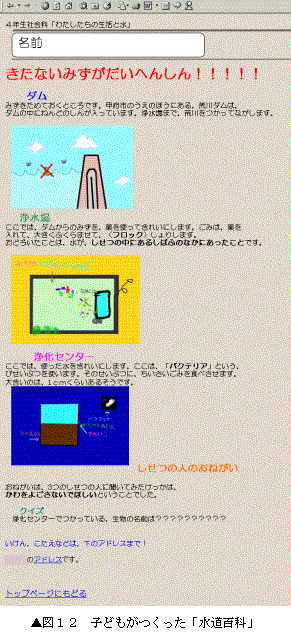 学習にあたっては,ダムや浄水場,浄化センターについて見学の機会や資料を均等に用意するが,子どもたち一人ひとりは,それらを網羅的に学習するのではなく,自分が疑問に思ったことを興味関心に応じて追究学習できるような場を設定した。それぞれが得た情報や思いについては,Webページとして保存した。ワープロソフトを活用し,お絵かきソフトで作成した絵や図,デジカメで撮影した画像などをテキストデータに貼り付けながら表現した。できあがった作品を仲間と見合い,電子メールを使って交流することで,情報や思いを共有し,社会的事象の見方・考え方を深めることをねらった。