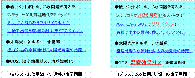 図1(a)は,本システムを使わない時の表示画面である。環境教育に関する学習用語がいくつか出ている。図1(b)は,本システムを利用した場合の表示画面である。図2では,「化石燃料」のように,環境教育に関する学習用語が,赤い文字列に変化し,リンクを付加し,その部分をクリックすると,学習用語の解説を閲覧することができる。また,関連する用語などについても,目次を用いて調べることができるようにした。
