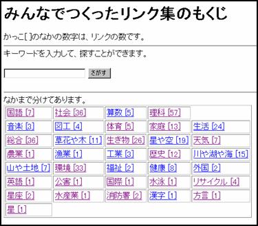 図4は,作成したリンク集のもくじ画面である。子どもたちが登録したカテゴリー別に一覧を表示するようにした。かっこ内の数字は,リンクの数を示している。例えば,国語[7]では登録数7件,社会[36]では登録数36件といったように表示される。