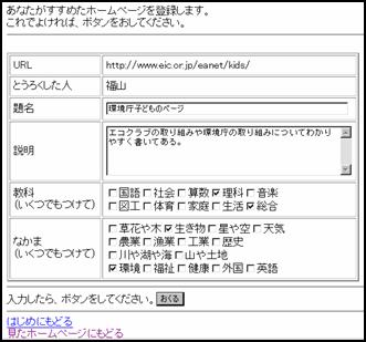 児童が検索エンジンを用いて学習情報を閲覧し,有効な学習情報を見つけた場合,登録画面から登録する。システムは,個人ログの記録にもとづいて,閲覧しているページのURLや登録者名を判別するようにした。URLは,学習者の入力の負担を軽減するために,自動的に取得するようにした。