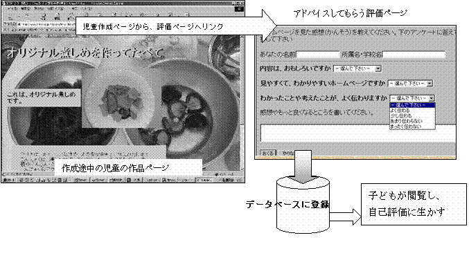 学校外からの評価を生かし,発信内容の推敲を支援するシステムを開発した。図7に,そのシステム活用の流れを示す。送信フォームに書き込んでもらうと,子どもたちが後で閲覧する評価ページには,書き込み内容の一覧が表示される。