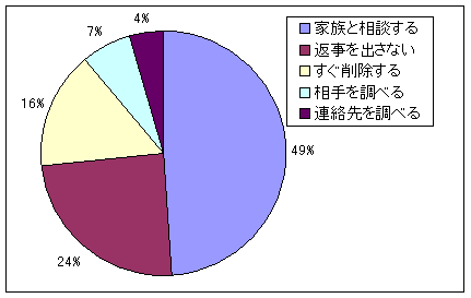 | 【授業の流れ】 (ア) 自作資料を読み,読んだ感想を発表しあう。 (イ) グループで,メールへの対応を考える。 (ウ) 対応策を全体で確認し,これから生かしていくようにまとめる。 |